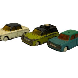 Te presentamos un set compuesto por 3 vehículos antiguos de juguete, fabricados principalmente en hojalata combinada con plástico, característicos de producciones de época en Argentina.